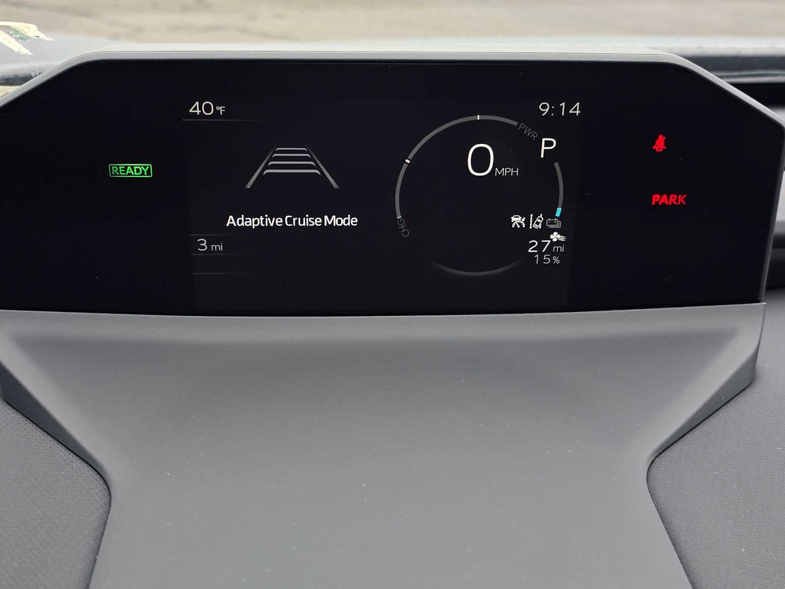 - Top-mount Multi-Information Display (MID) with indicators and 7-in. LCD display with speedometer, charge meter, power output meter, drive mode indicators, instrumentation and customizable settings, odometer, tripmeters, clock, outside temperature, rear passenger seatbelt indicators, fuel economy information, trip timer, charging information and settings, and warning messages