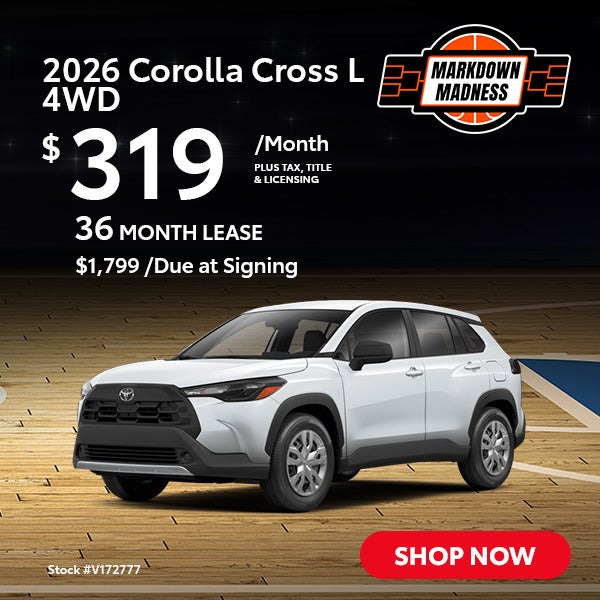 Terms available on approved credit through Toyota Financial Services (TFS) at participating Toyota dealers. Not all customers qualify. Lease example based on 2026 Corolla Cross L 4WD with Total SRP of $29013, net capitalized cost of $27385, and a lease end purchase amount of $19149. $1799 Due At Signing includes $1799 customer down payment, first month's payment of $319 for 36 months, and a $750 Acquisition Fee. Security deposit required with exception of prior Toyota Financial Services (TFS) financing history and/or TFS credit rating in which a security deposit may be waived. Tax, title, license are extra. Cash from TMS must be applied as a capitalized cost reduction (down payment) that is excluded from due at signing; no cash back option. Dealer contribution may vary and could affect lease payment. Individual dealer prices, monthly payment, and other terms and offers may vary. Must lease from participating dealer's stock and terms are subject to vehicle availability. Lessee responsible for maintenance, excess wear and use, and will pay $0.15 per mile for all mileage over 30000 miles. $350 disposition fee is due at lease end. Doc Fee: $200. Cannot be combined with TFS Finance Cash, Down Payment Assistance, Trade-in Assistance, Customer Cash, APR, Finance Subvention Cash. Offer available in OR regardless of buyer's residency; void where prohibited. Expires Tue Mar 31 2026. Dealer sets final price. See your participating Toyota dealer for details. Toyota Financial Services is a service mark used by Toyota Motor Credit Corporation (TMCC). Retail installment accounts may be owned by TMCC or its securitization affiliates and lease accounts may be owned by Toyota Lease Trust (TLT) or its securitization affiliates. TMCC is the servicer for accounts owned by TMCC, TLT, and their securitization affiliates. VIN: V172777.