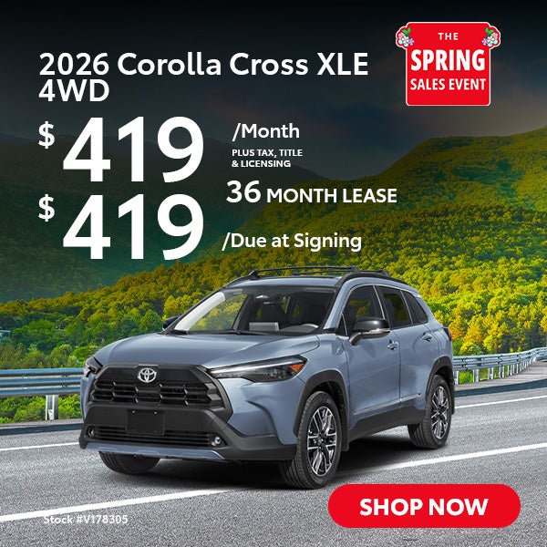 Terms available on approved credit through Toyota Financial Services (TFS) at participating Toyota dealers. Not all customers qualify. Lease example based on 2026 Corolla Cross XLE 4WD with Total SRP of $36990, net capitalized cost of $35125, and a lease end purchase amount of $23957. $419 Due At Signing includes $419 customer down payment, first month's payment of $419 for 36 months, and a $750 Acquisition Fee. Security deposit required with exception of prior Toyota Financial Services (TFS) financing history and/or TFS credit rating in which a security deposit may be waived. Tax, title, license are extra. Cash from TMS must be applied as a capitalized cost reduction (down payment) that is excluded from due at signing; no cash back option. Dealer contribution may vary and could affect lease payment. Individual dealer prices, monthly payment, and other terms and offers may vary. Must lease from participating dealer's stock and terms are subject to vehicle availability. Lessee responsible for maintenance, excess wear and use, and will pay $.15 per mile for all mileage over 22500 miles. $350 disposition fee is due at lease end. Doc Fee: $200. Cannot be combined with TFS Finance Cash, Down Payment Assistance, Trade-in Assistance, Customer Cash, APR, Finance Subvention Cash. Offer available in OR regardless of buyer's residency; void where prohibited. Expires Sun May 03 2026. Dealer sets final price. See your participating Toyota dealer for details. Toyota Financial Services is a service mark used by Toyota Motor Credit Corporation (TMCC). Retail installment accounts may be owned by TMCC or its securitization affiliates and lease accounts may be owned by Toyota Lease Trust (TLT) or its securitization affiliates. TMCC is the servicer for accounts owned by TMCC, TLT, and their securitization affiliates. Stock # V178305.