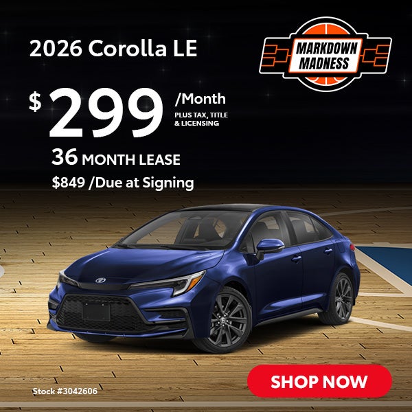 Terms available on approved credit through Toyota Financial Services (TFS) at participating Toyota dealers. Not all customers qualify. Lease example based on 2026 Corolla LE with Total SRP of $24808, net capitalized cost of $21852, and a lease end purchase amount of $16373. $849 Due At Signing includes $849 customer down payment, first month's payment of $299 for 36 months, and a $750 Acquisition Fee. Security deposit required with exception of prior Toyota Financial Services (TFS) financing history and/or TFS credit rating in which a security deposit may be waived. Tax, title, license are extra. Cash from TMS must be applied as a capitalized cost reduction (down payment) that is excluded from due at signing; no cash back option. Dealer contribution may vary and could affect lease payment. Individual dealer prices, monthly payment, and other terms and offers may vary. Must lease from participating dealer's stock and terms are subject to vehicle availability. Lessee responsible for maintenance, excess wear and use, and will pay $0.15 per mile for all mileage over 30000 miles. $350 disposition fee is due at lease end. Doc Fee: $200. Cannot be combined with TFS Finance Cash, Down Payment Assistance, Trade-in Assistance, Customer Cash, APR, Finance Subvention Cash. Offer available in OR regardless of buyer's residency; void where prohibited. Expires Tue Mar 31 2026. Dealer sets final price. See your participating Toyota dealer for details. Toyota Financial Services is a service mark used by Toyota Motor Credit Corporation (TMCC). Retail installment accounts may be owned by TMCC or its securitization affiliates and lease accounts may be owned by Toyota Lease Trust (TLT) or its securitization affiliates. TMCC is the servicer for accounts owned by TMCC, TLT, and their securitization affiliates. VIN: 3042606.