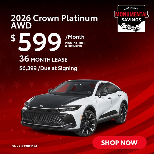Terms available on approved credit through Toyota Financial Services (TFS) at participating Toyota dealers. Not all customers qualify. Lease example based on 2026 Crown Platinum AWD with Total SRP of $57863, net capitalized cost of $48532, and a lease end purchase amount of $30667. $6399 Due At Signing includes $6399 customer down payment, first month's payment of $599 for 36 months, and a $650 Acquisition Fee. Security deposit required with exception of prior Toyota Financial Services (TFS) financing history and/or TFS credit rating in which a security deposit may be waived. Tax, title, license are extra. Cash from TMS must be applied as a capitalized cost reduction (down payment) that is excluded from due at signing; no cash back option. Dealer contribution may vary and could affect lease payment. Individual dealer prices, monthly payment, and other terms and offers may vary. Must lease from participating dealer's stock and terms are subject to vehicle availability. Lessee responsible for maintenance, excess wear and use, and will pay $0.15 per mile for all mileage over 30000 miles. $350 disposition fee is due at lease end. Doc Fee: $200. Cannot be combined with TFS Finance Cash, Down Payment Assistance, Trade-in Assistance, Customer Cash, APR, Finance Subvention Cash. Offer available in OR regardless of buyer's residency; void where prohibited. Expires Mon Mar 02 2026. Dealer sets final price. See your participating Toyota dealer for details. Toyota Financial Services is a service mark used by Toyota Motor Credit Corporation (TMCC). Retail installment accounts may be owned by TMCC or its securitization affiliates and lease accounts may be owned by Toyota Lease Trust (TLT) or its securitization affiliates. TMCC is the servicer for accounts owned by TMCC, TLT, and their securitization affiliates. VIN: T3015194.